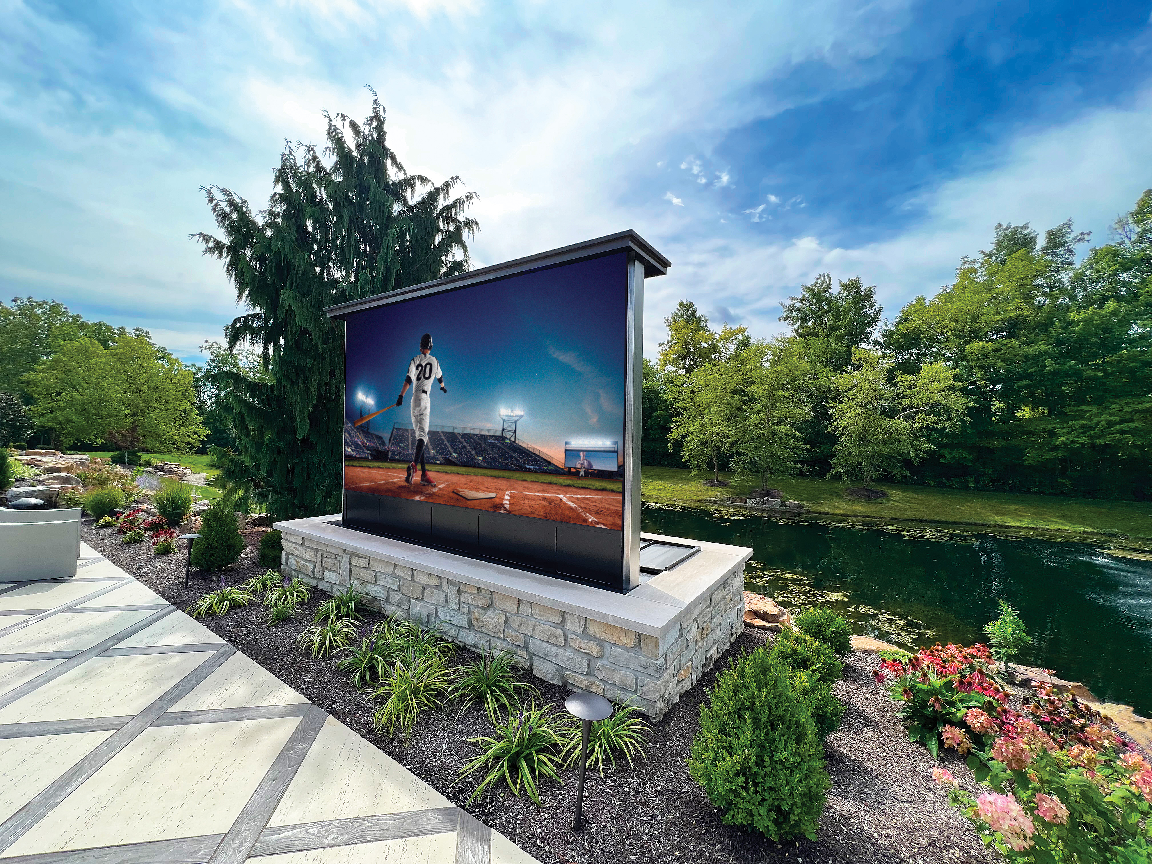 4. The Big Screen Experience, Al Fresco: Outdoor TVs, while more expensive than indoor models, are rugged, weatherized, and designed to perform better in harsh sunlight. These TVs are extremely bright, can withstand snow, humidity, extreme heat, and even bugs. If you want to hide it when not in use, your HTA Certified integrator can install a motorized lift mechanism so the TV disappears when not in use. Large outdoor LED video walls are making headway as an option for residences. Commonly used for advertising purposes, LED video walls offer a bright, customizable, and weather-ready viewing experience for outdoor applications at home. See the video embedded here of a 201" LED TV rise and literally unfold out of the ground!
