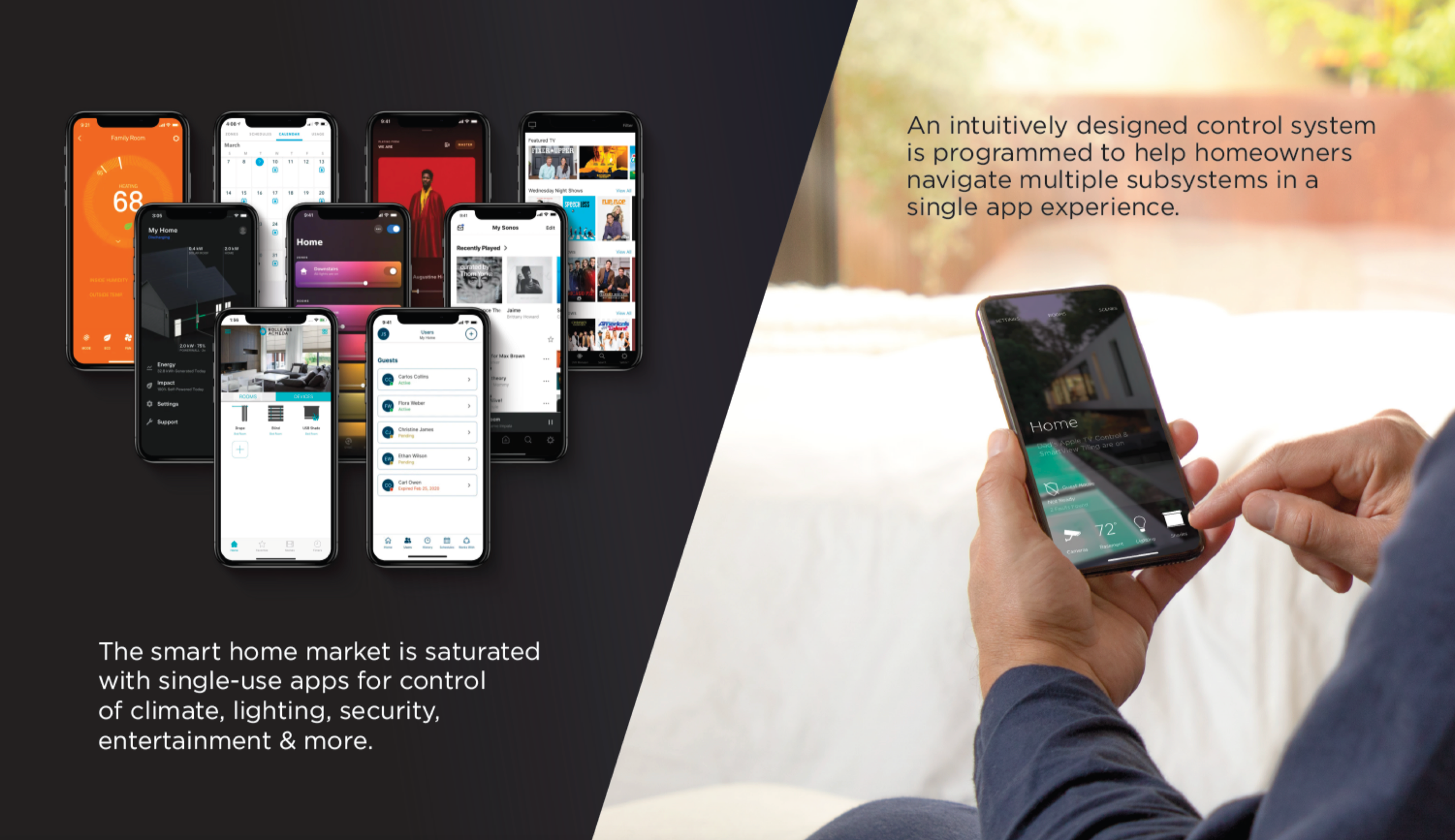 All your different home control apps (music, climate, lights, shades, cameras, pool, locks, fans, etc.) will have a different name, look, and feel. So your pool app (often called ‘Jandy’) will look and feel different from your alarm app (it could be called ‘Elk’) which will look and feel different from your lock app (called ‘Yale’)…you get the picture. It will not be super easy teaching the babysitter how to operate your home.