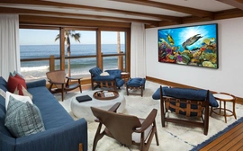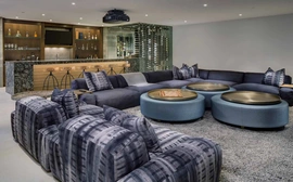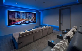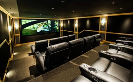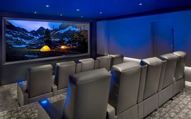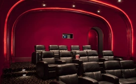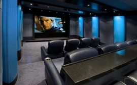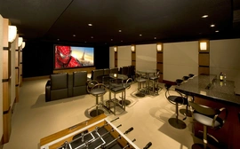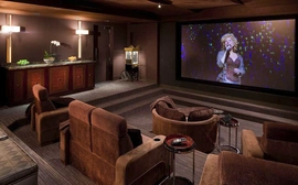 The original room was not properly engineered so performance results were sub-standard. PMI was brought in to rebuild the environment. All speakers are now concealed, center speaker behind an acoustically transparent screen; acoustically transparent stretch fabric hides loudspeakers, acoustical treatments. Projector is in its own enclosure to keep it quiet, port glass is neutral so picture goes through, all concealed so you don't see it, you don't hear it.